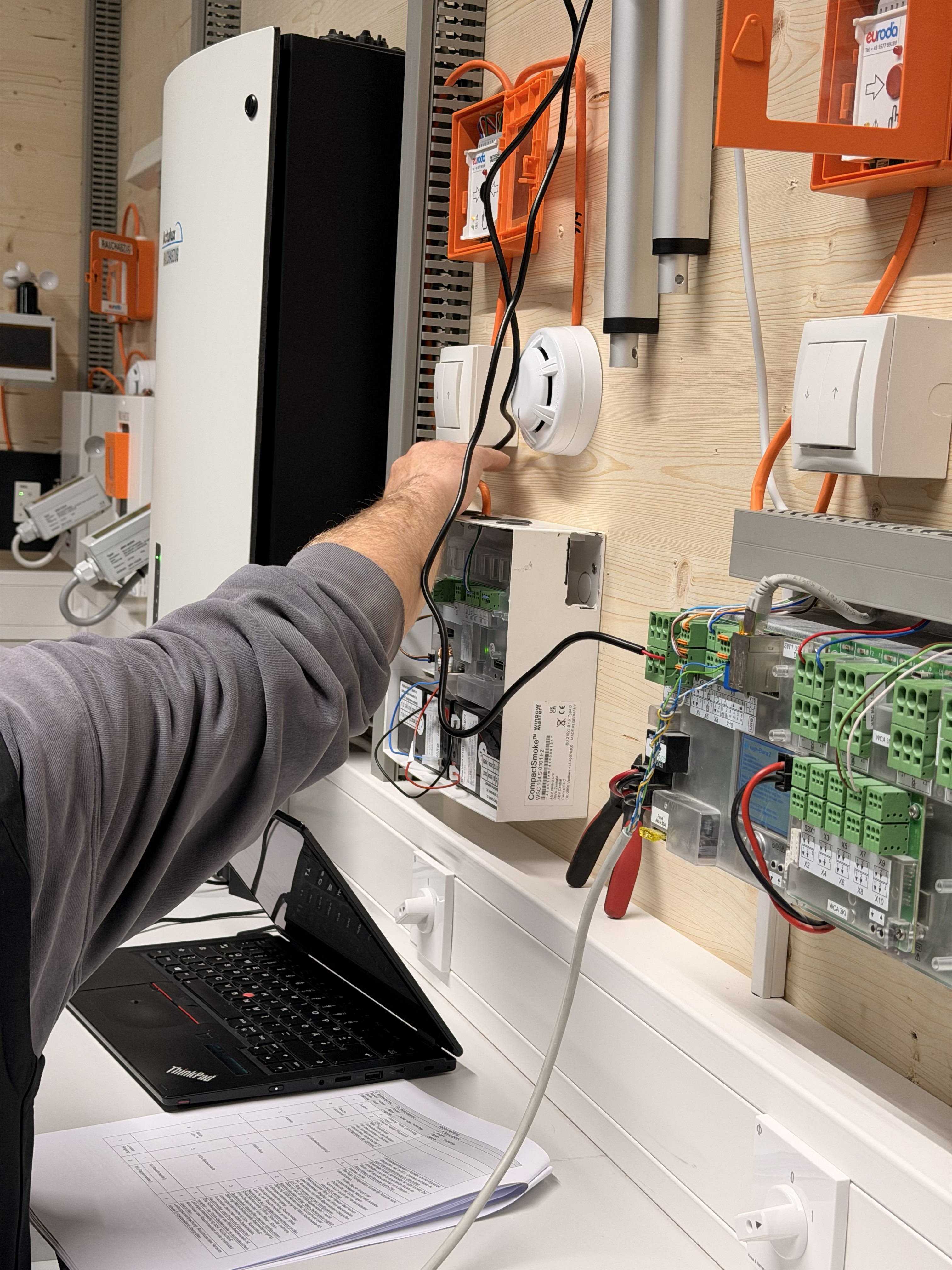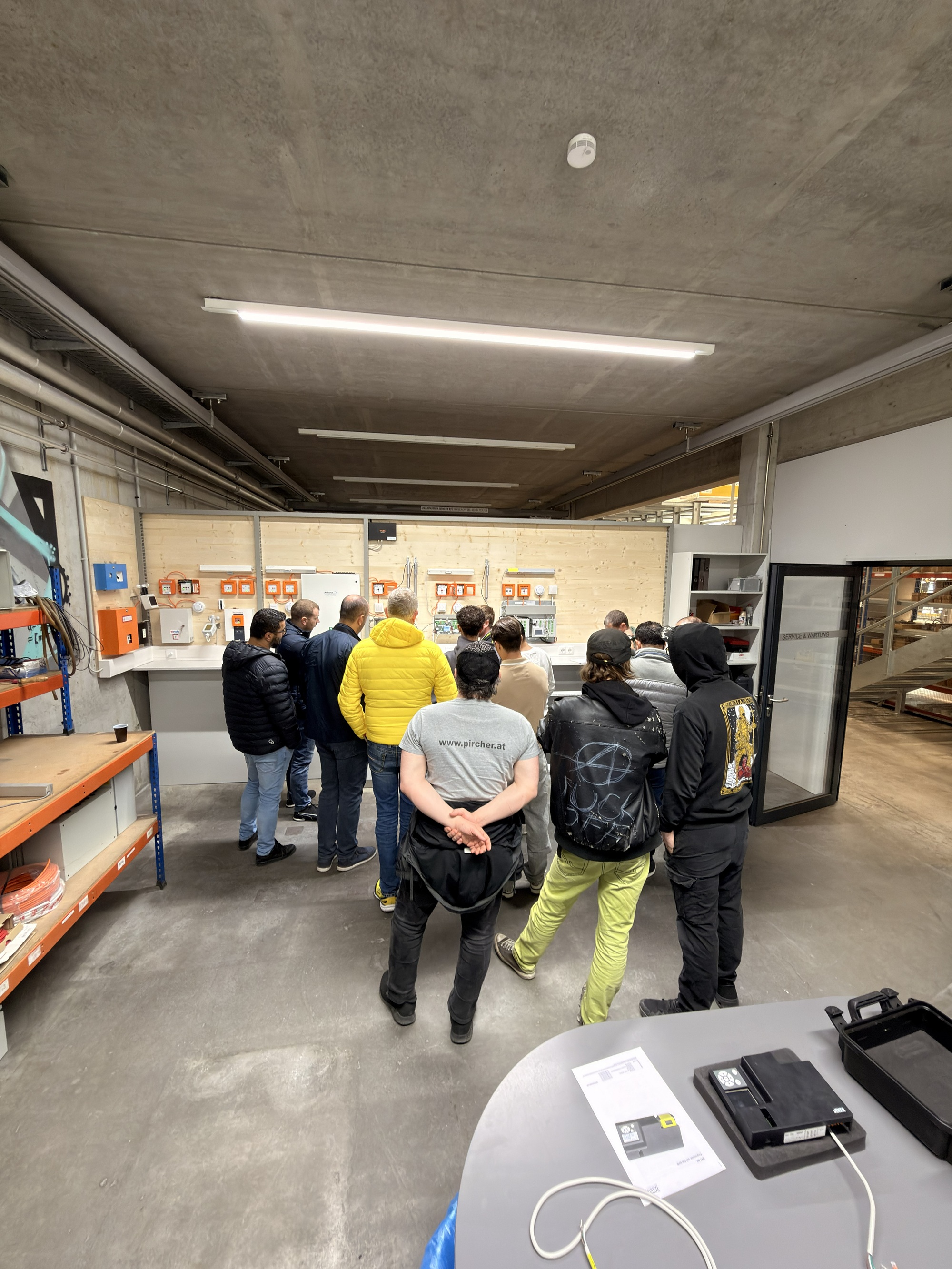 Die Praxis fand sowohl im Musterraum statt, wo dieTeilnehmenden die einzelnen Komponenten und Funktionen direkt kennenlernenkonnten, als auch an unserer Wand mit den verschiedenen Steuerungen, wo dasgelernte vertieft werden konnte.