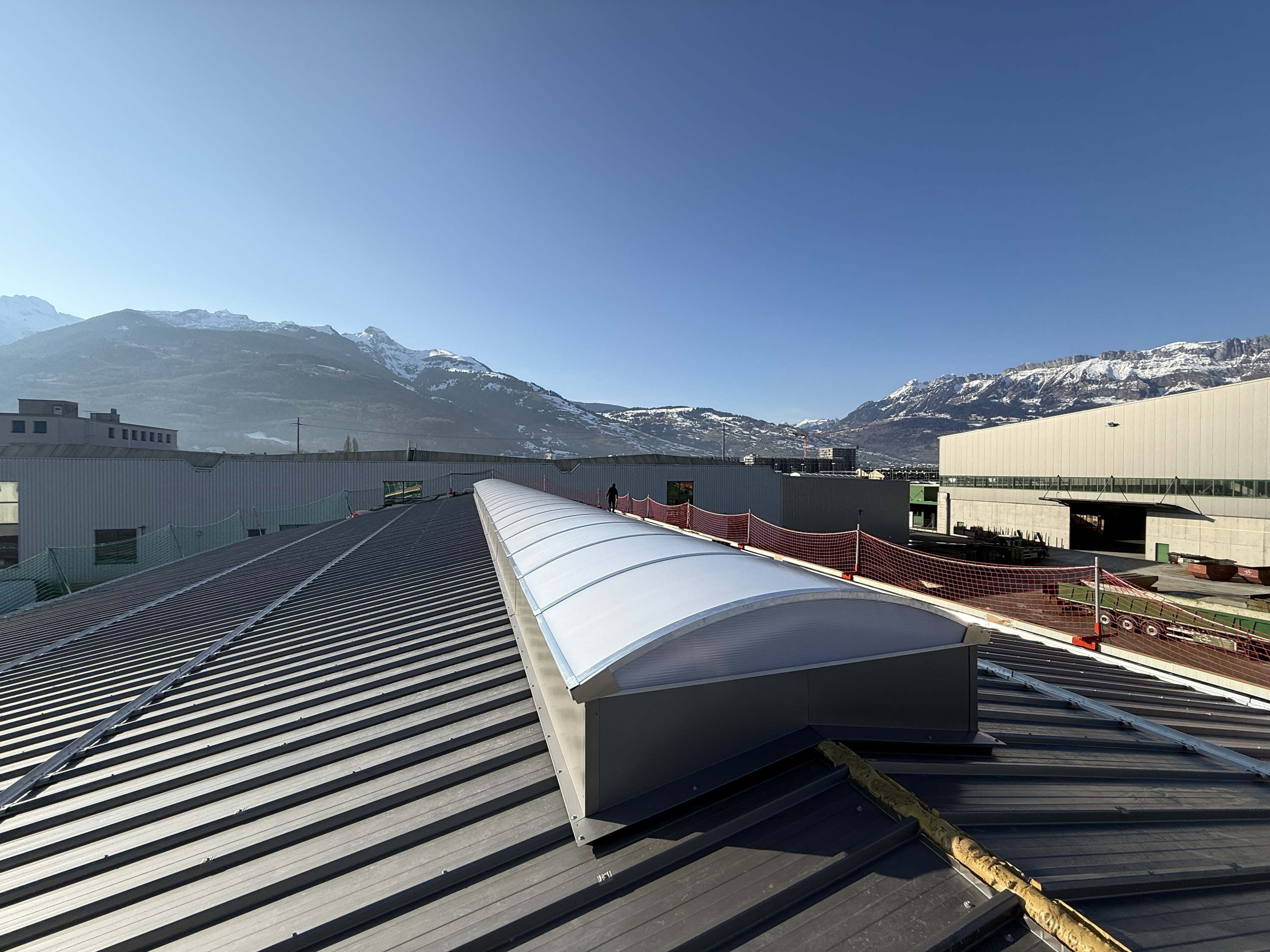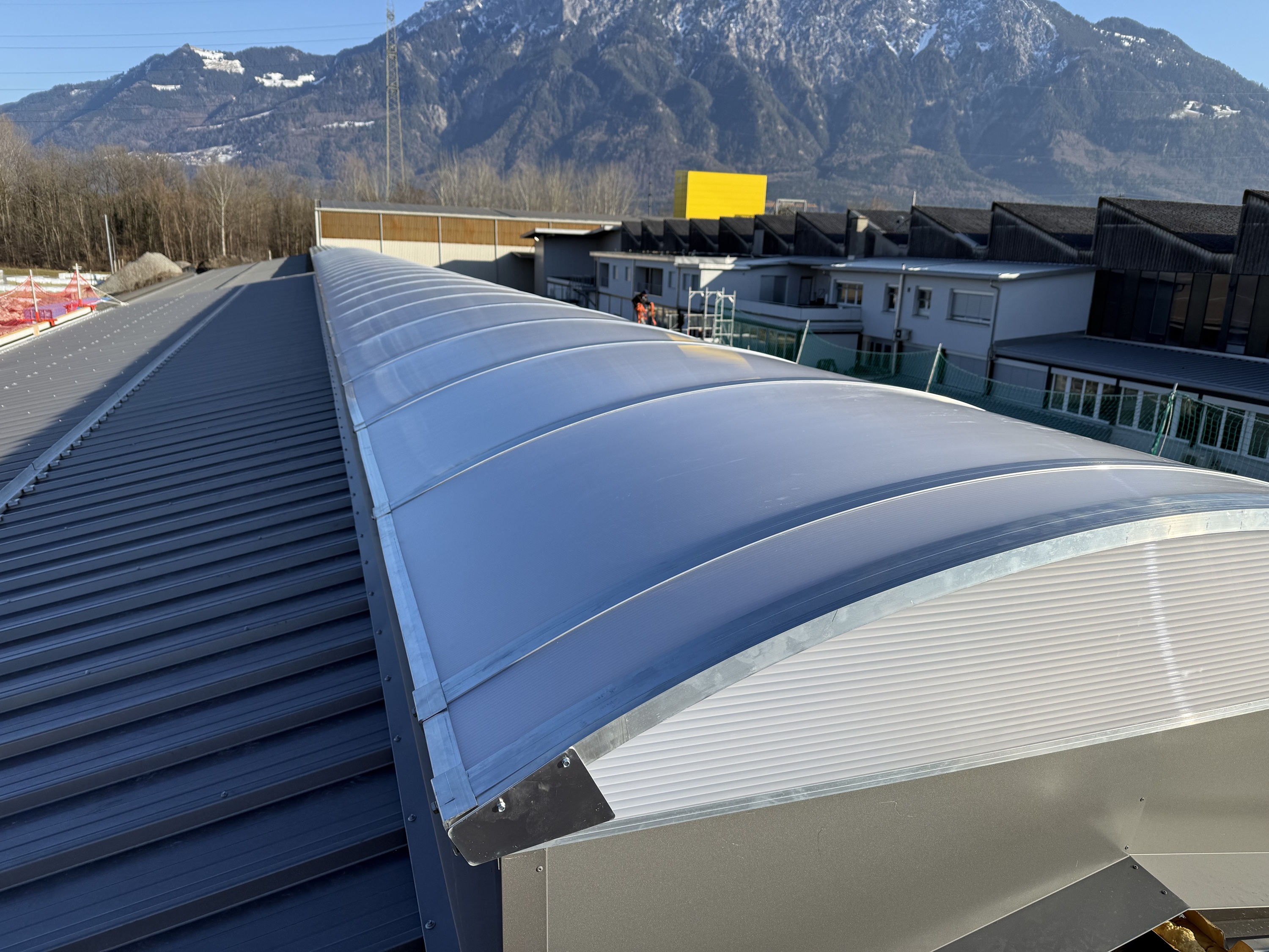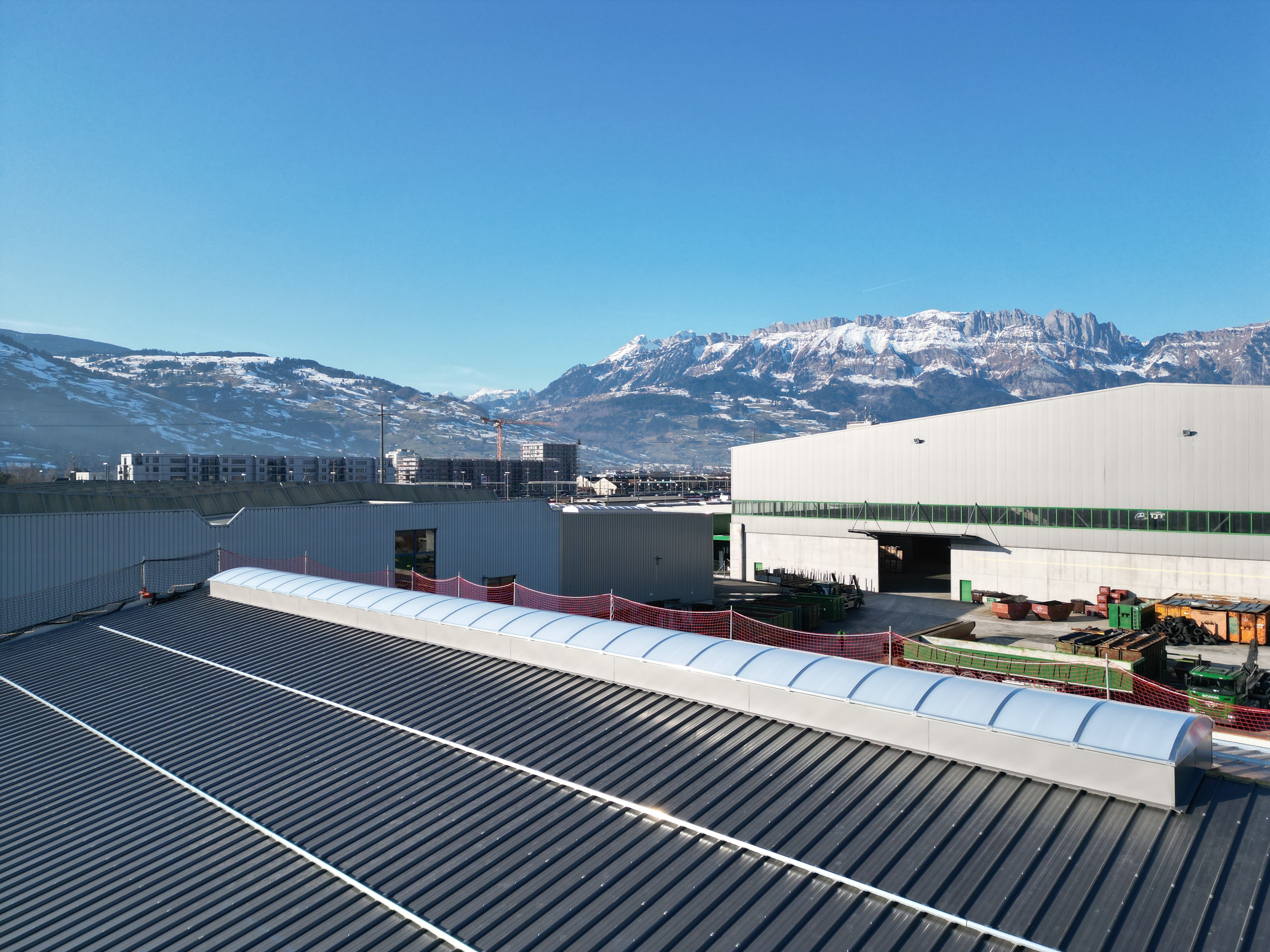Für die System Wolf AG wurde auf der Baustelle des Vereins für Abfallentsorgung Buchs ein hochwertiges Oberlichtsystem realisiert. Zum Einsatz kam ein tonnenförmiges, zweischaliges Lichtband mit einer Größe von 2.000 × 28.000 mm, das optimale Tageslichtverhältnisse in der Halle sicherstellt.